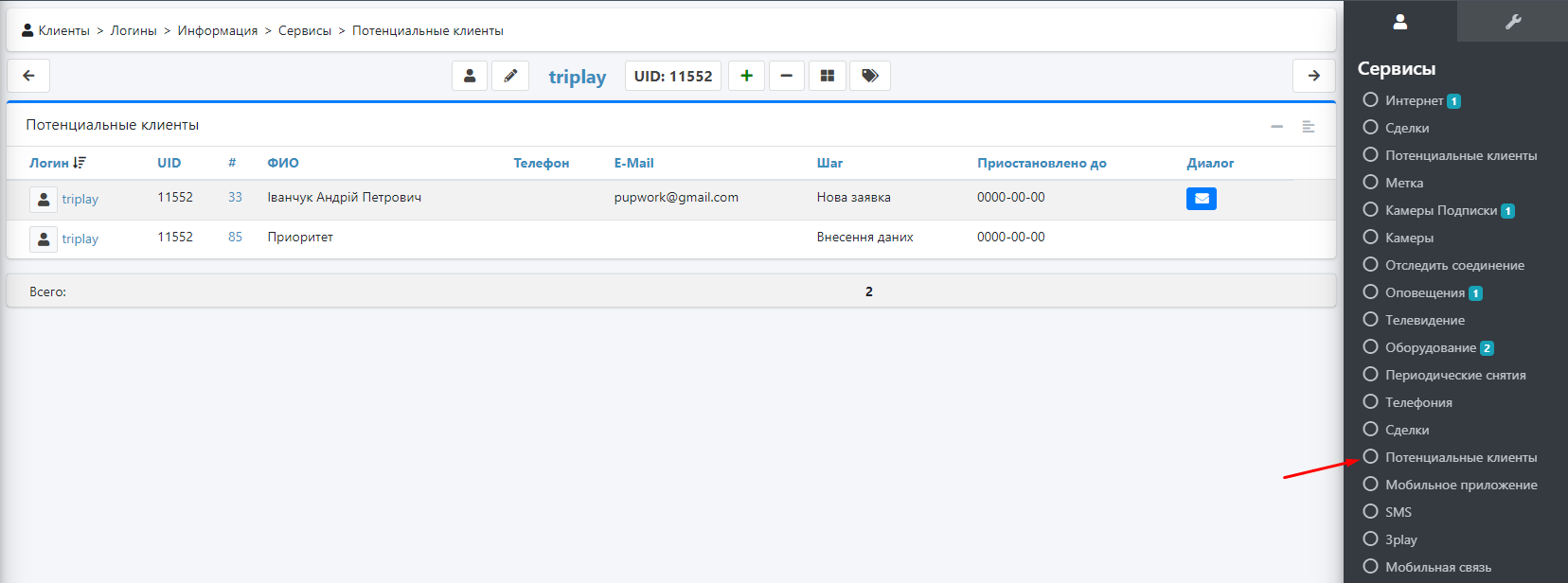 Меню: Клиенты>Логины>Информация>Сервисы>Потенциальные клиенты