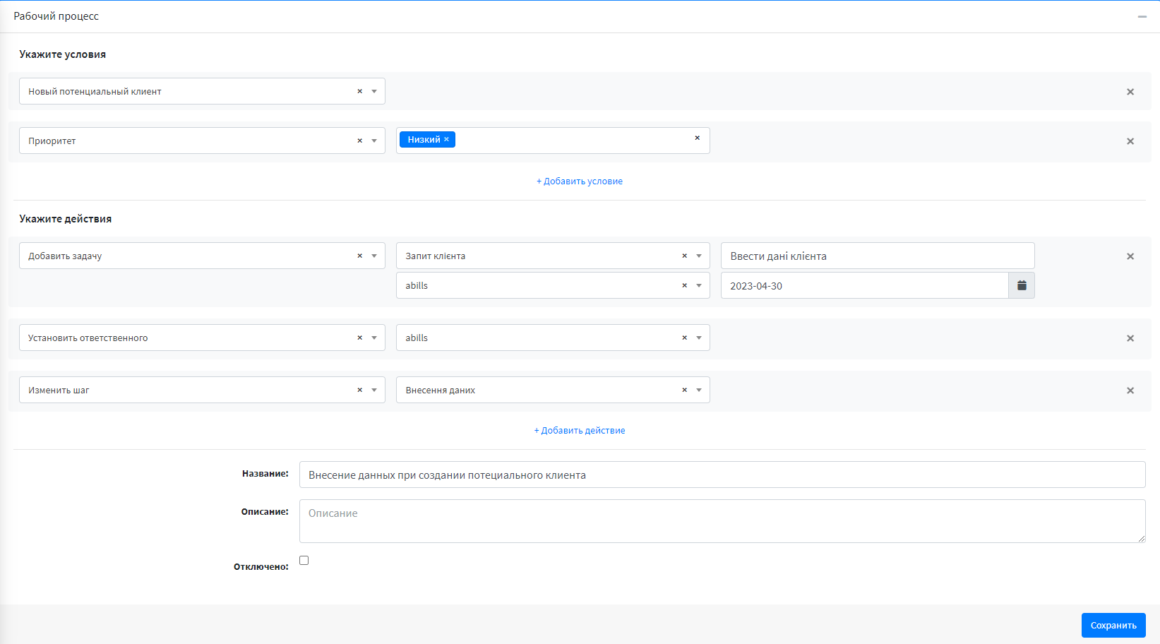 Рабочие процессы автоматизируют работу с модулем Crm, делая ее более эффективной и занимающей меньше времени.