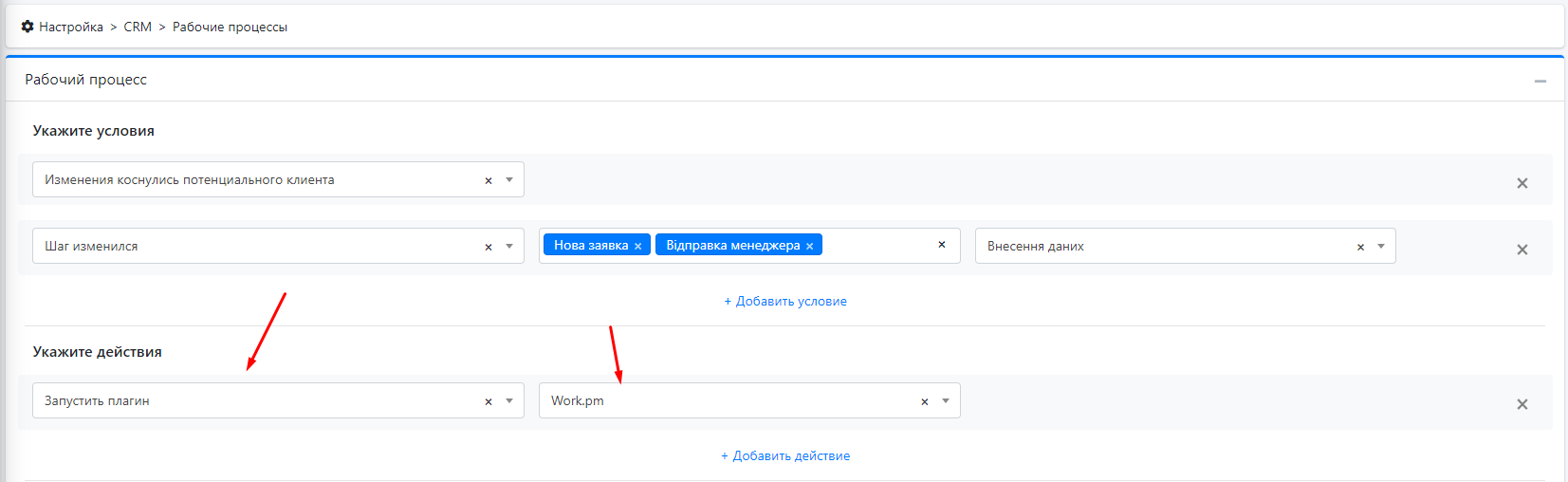 При выборе этой опции вы можете указать плагин, который должен быть запущен из выпадающего списка. Плагины для системы хранятся в каталоге: Abills/modules/Crm/Plugins/Workflow.