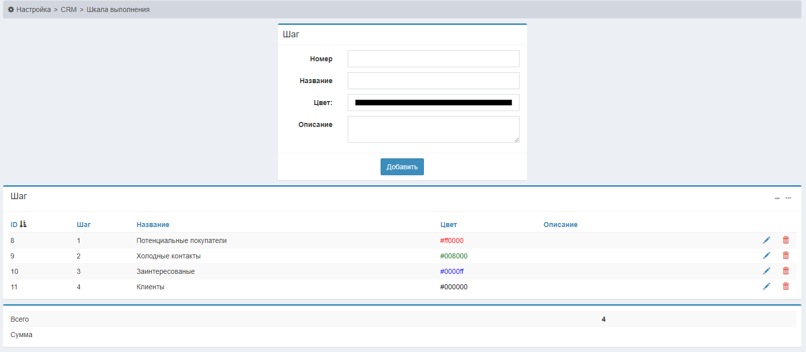 Для начала нужно зайти в пункт меню Настройка>CRM>Шкала выполнения.