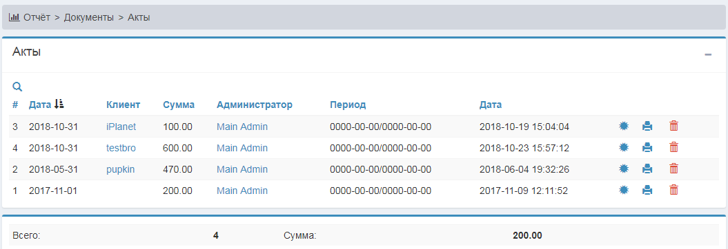 Просмотреть, распечатать список созданных актов можно через меню Отчёт>Документы>Акты.