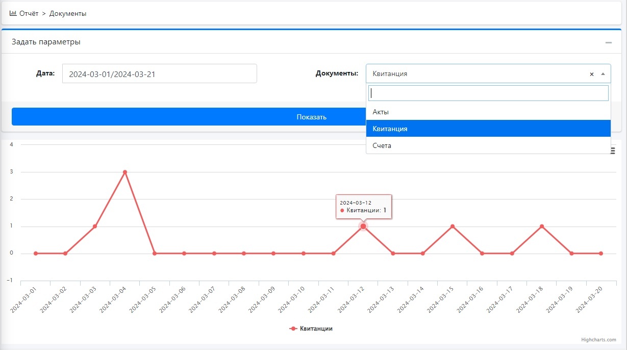 В меню Отчёт>Документы>Документы можно отобразить созданные документы (акты, квитанции, счета) за выбранный промежуток времени, используя соответствующие фильтры. Полученные результаты можно распечатать или сохранить в разных форматах (png, jpeg, pdf, svg).