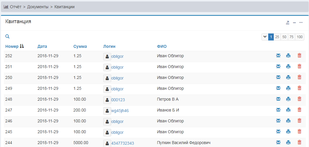 Просмотреть, распечатать список созданных квитанций можно через меню Отчёт>Документы>Квитанции.
