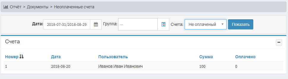 Тут вы можете посмотреть созданные, но еще не оплаченные счета. Можно указать интересующий вас период, и группу абонентов.