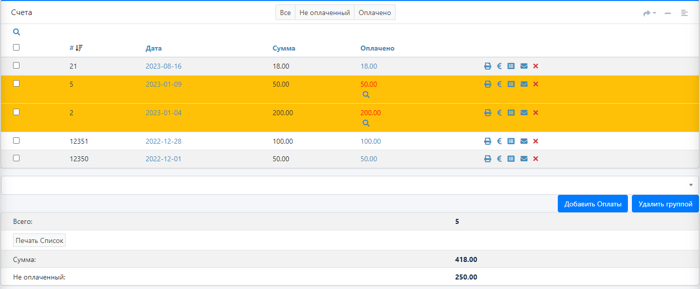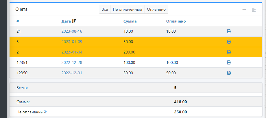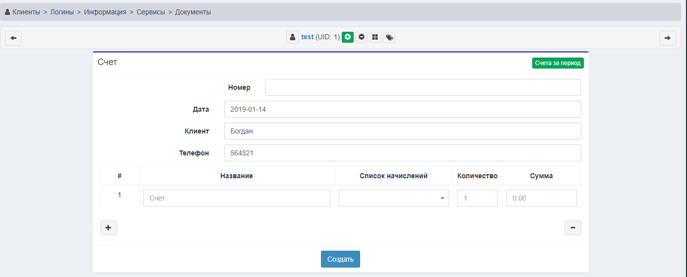 - Список выписанных счетов абонентов и форма создания счетов. Форма создания счета отображается только если зайти в документы через учётную карточку абонента