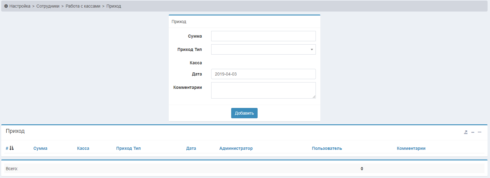 После этого мы можем подняться на уровень выше, в Настройка>Сотрудники>Работа с кассами>Приход, и уже здесь мы можем добавлять приходы.