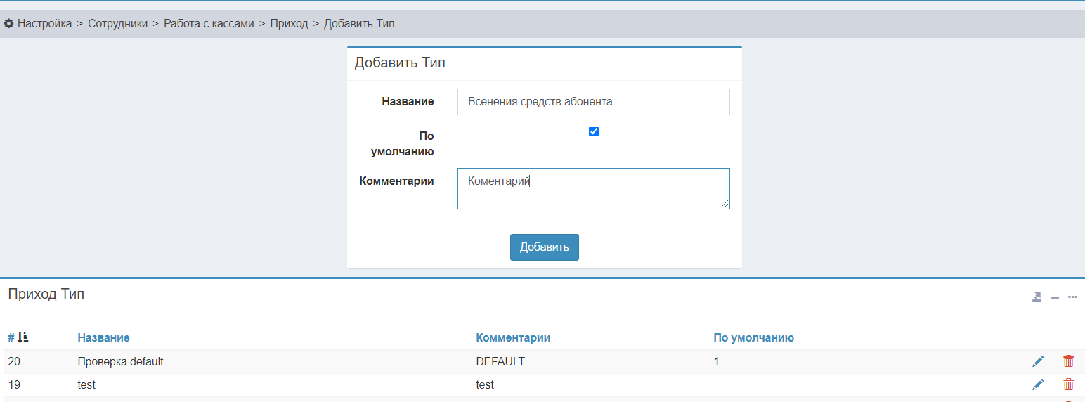 Чтобы добавлять приход, нужно для начала зайти в меню Настройка>Сотрудники>Работа с кассами>Приход>Добавить Тип. Тут все просто, мы увидим маленькую форму, заполняем ее и нажимаем кнопку Добавить. При отметке галочки по умолчанию, данный тип прихода будет считаться по умолчанию при внесения средств с карточки абонента. Так же здесь можно изменять эти же типы, удалять их.