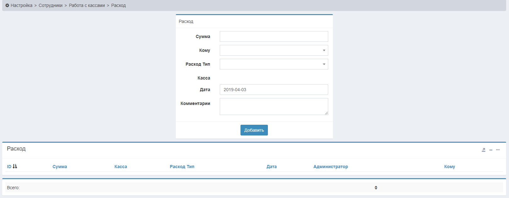 После этого мы можем подняться на уровень выше, в Настройка>Сотрудники>Работа с кассами>Расход, и уже здесь мы можем добавлять расходы.