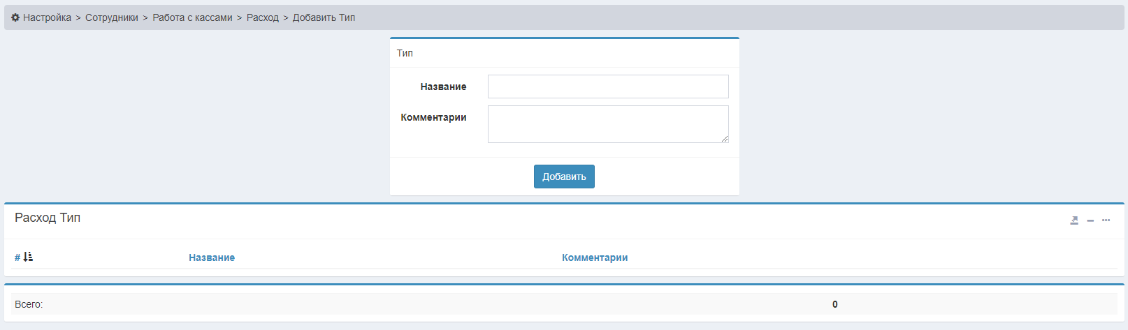 Чтобы добавлять расходы, нужно для начала зайти в меню Настройка>Сотрудники>Работа с кассами>Расход>Добавить Тип. Тут все просто, мы увидим маленькую форму, заполняем ее и нажимаем кнопку Добавить. Также здесь можно изменять эти же типы, удалять их.