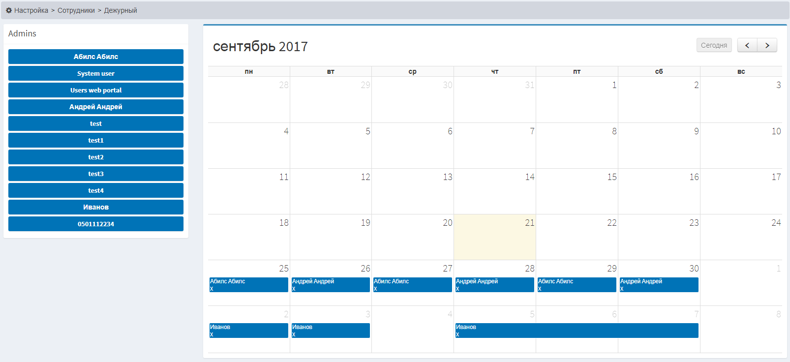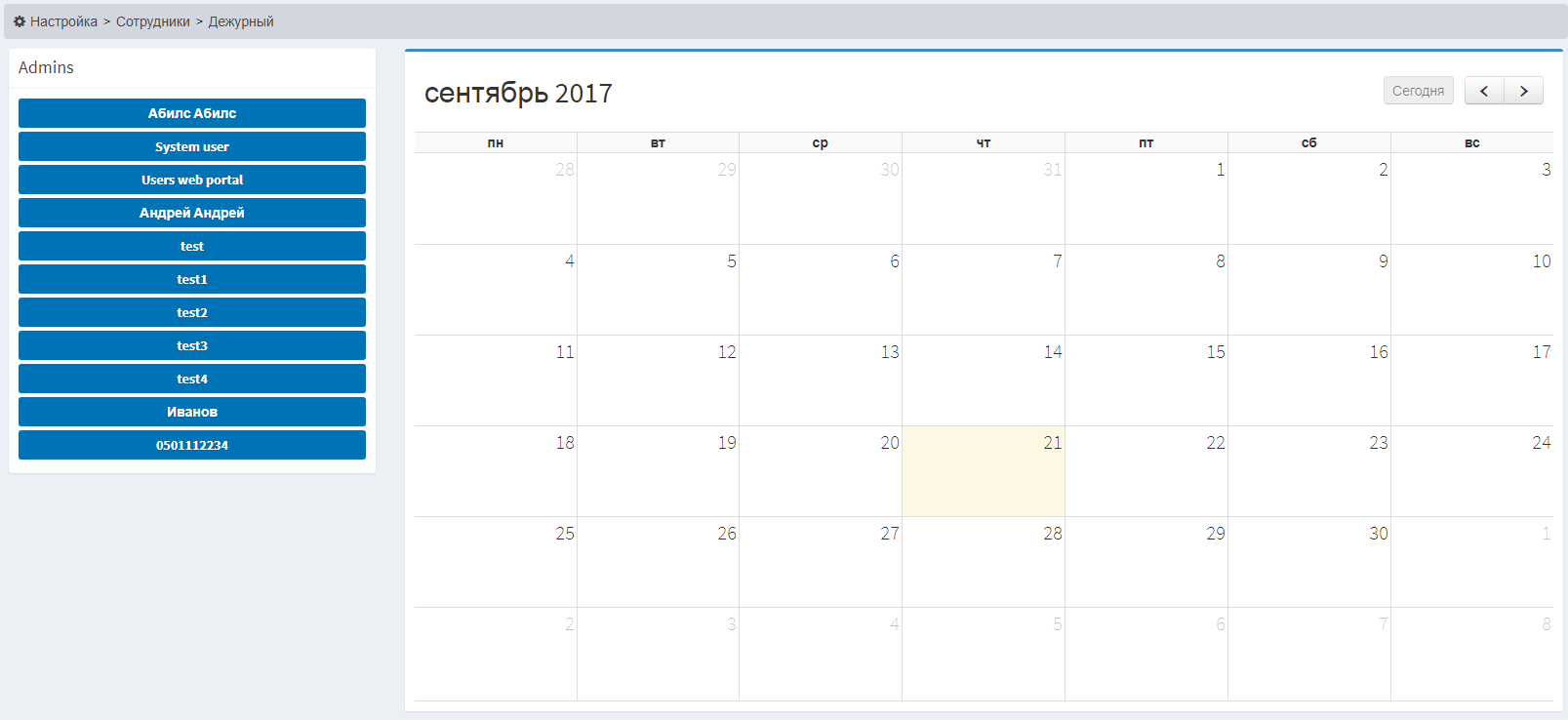 Перейдя в пункт меню Настройки>Сотрудники>Дежурный мы сможем увидеть список всех администраторов и календарь для заполнения.