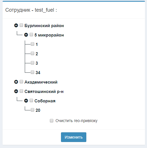 | Очистить гео-привязку | Удаляет все привязанные адреса к сотруднику |