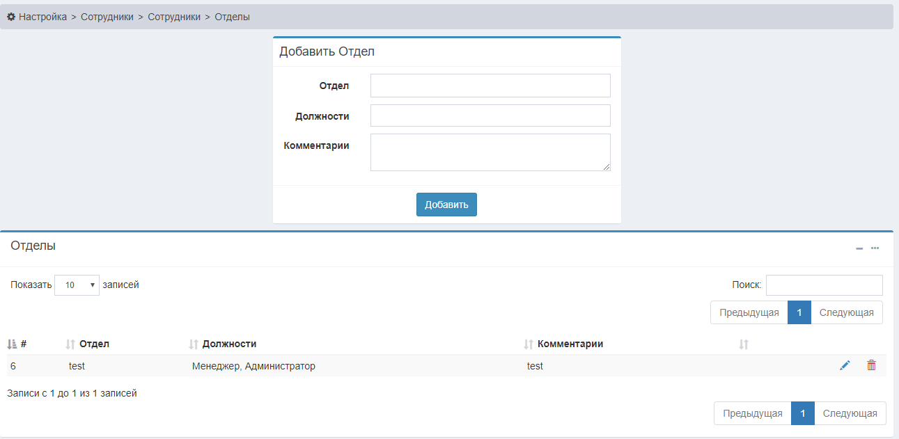 Редактирование и удаление отделов осуществляется с помощью кнопок "Карандаша" и "Корзины" в таблице отделов.
