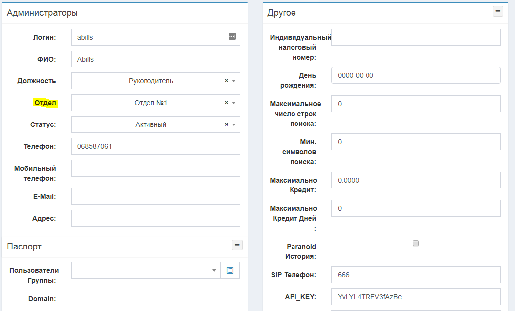Чтобы назначить отдел на нашего сотрудника, заходим в меню Настройка>Сотрудники>Сотрудники и выбираем сотрудника нажатием на "Карандаш" в таблице сотрудников. В форме, которая откроется, мы выбираем из выпадающего списка отдел, к которому относиться сотрудник.