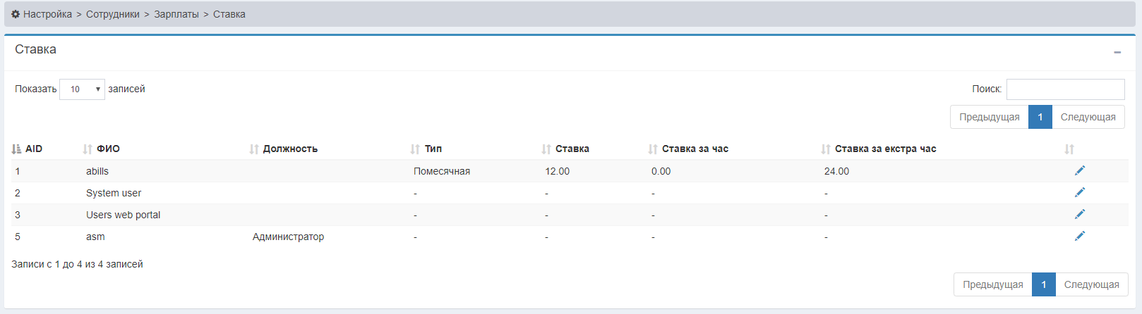 Для начала работы, нужно зайти в меню Настройки>Сотрудники>Зарплаты>Ставка. Покажется список всех администраторов в системе.