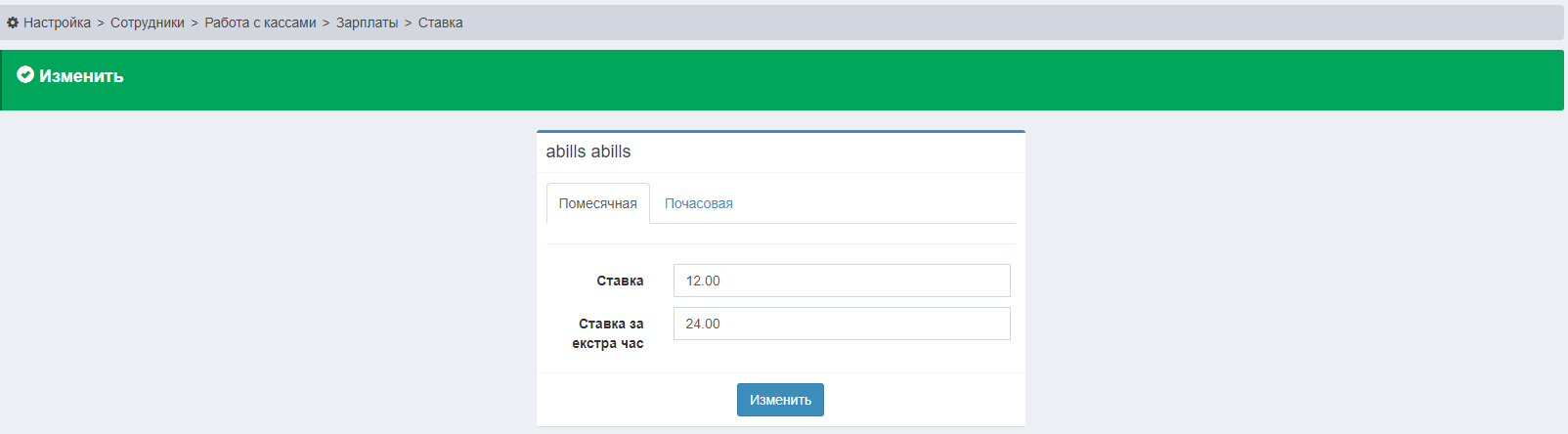 В одной из вкладок нужно заполнить Ставку за месяц/час и Ставку за внеурочный час и нажать кнопку Изменить.