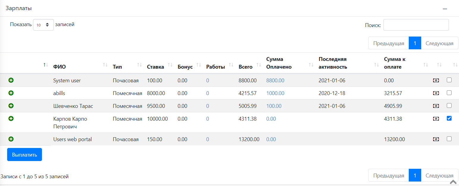В списке сотрудников ставим галочку напротив нужного сотрудника и нажимаем кнопку выплатить.
