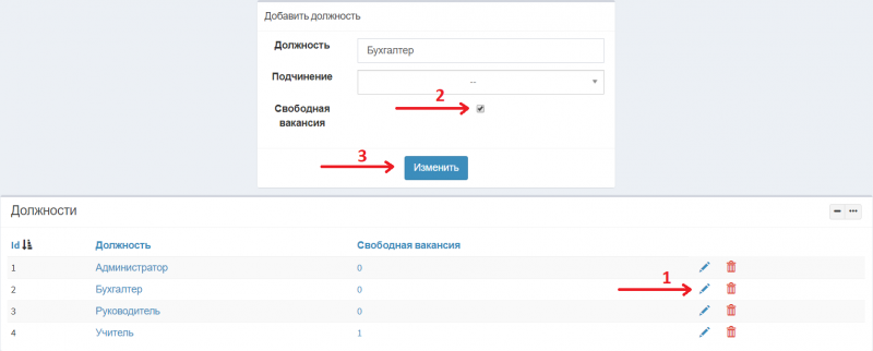 2. Нажмите «Изменить» в поле подходящей должности. Задайте галочку в поле «Свободная вакансия». Нажмите на кнопку «Изменить».