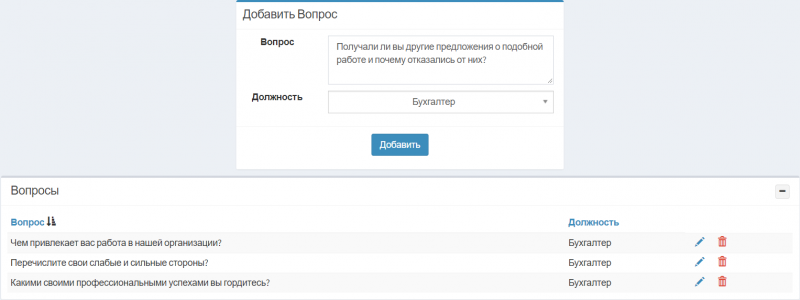 3. Перейдите в пункт меню Настройка>Сотрудники>Сотрудники>Анкета сотрудника>Вопросы и добавьте несколько вопросов, ответы на которые даст анкетирующийся при составлении анкеты на выбранною должность.