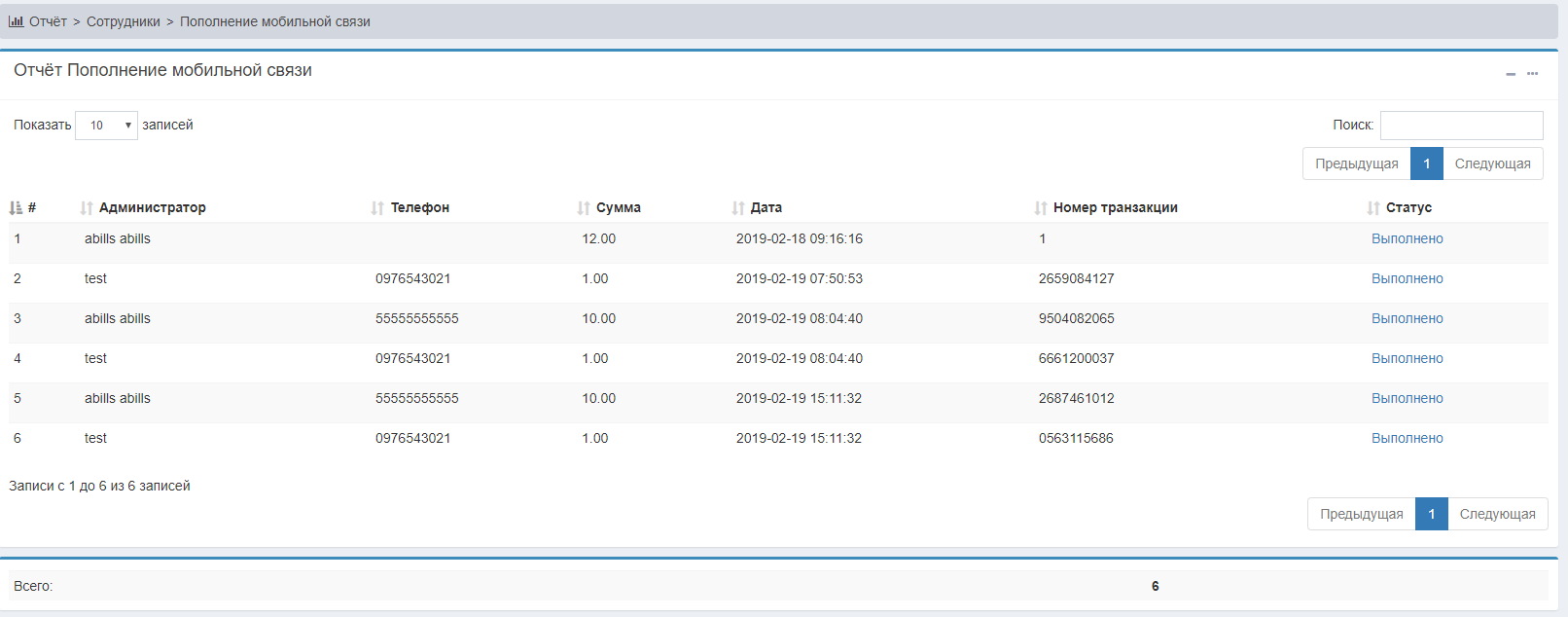 Информация обо всех выполненных и невыполненных пополнениях будут заноситься в таблицу "Отчёт Пополнение мобильной связи", которую можно увидеть в меню Отчет>Сотрудники>Пополнение мобильной связи.