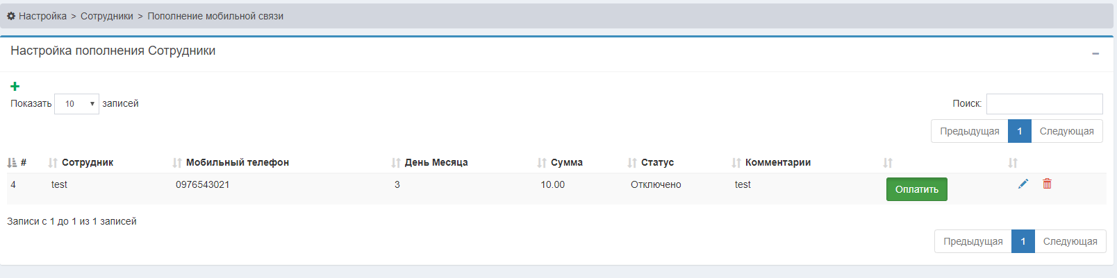 Зайти в Настройка>Сотрудники>Пополнение мобильной связи.