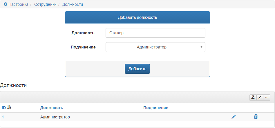 Настройка>Сотрудники>Должности