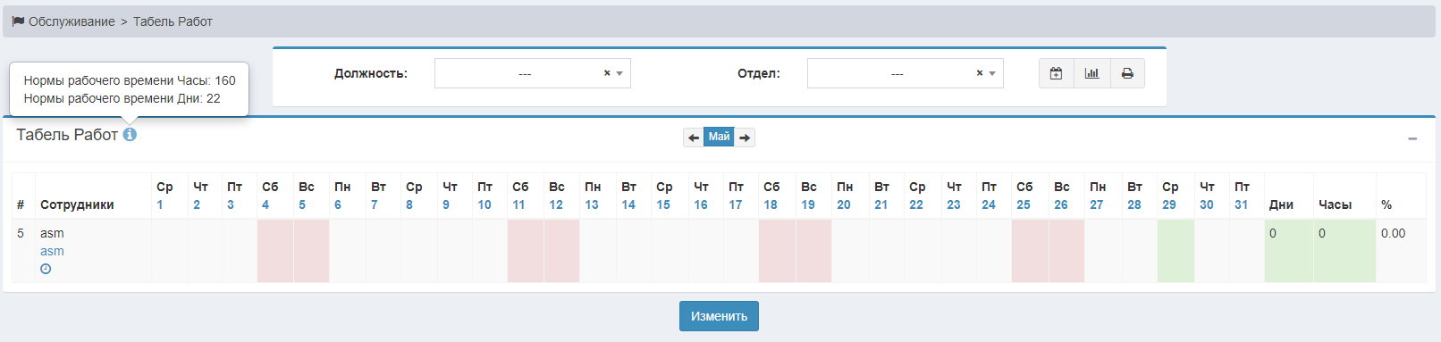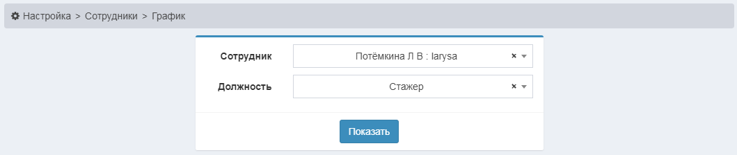 Пр просмотре графика работы сотрудников есть возможность воспользоваться фильтром - просмотреть графики работы сотрудников как по должностям так и по отдельному сотруднику.