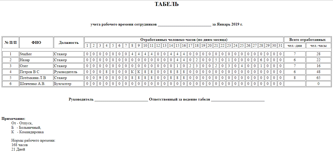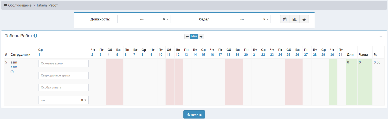 - Кнопка с иконкой принтера открывает форму для печати табеля работ.