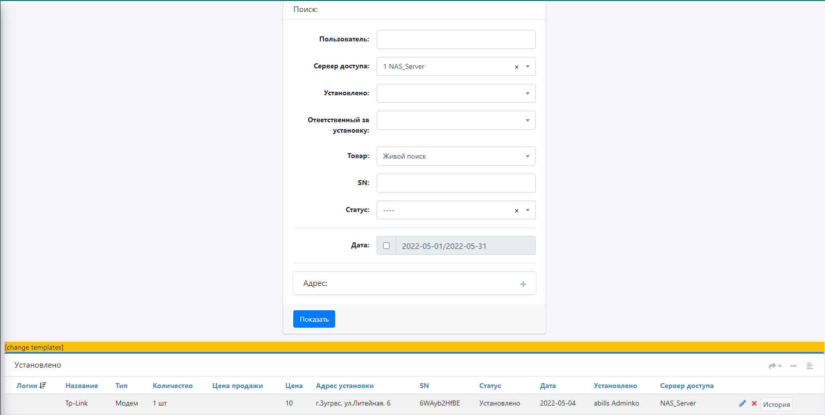 Здесь отображается информация про установленные ТМЦ к выбранному серверу доступа.