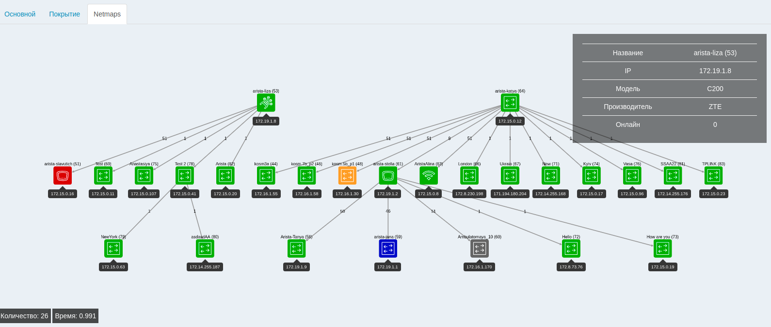 Графически отображает оборудование связанное через uplink-порты и его состояние. По клику отображается дополнительная информация.