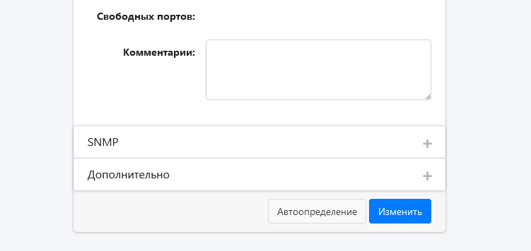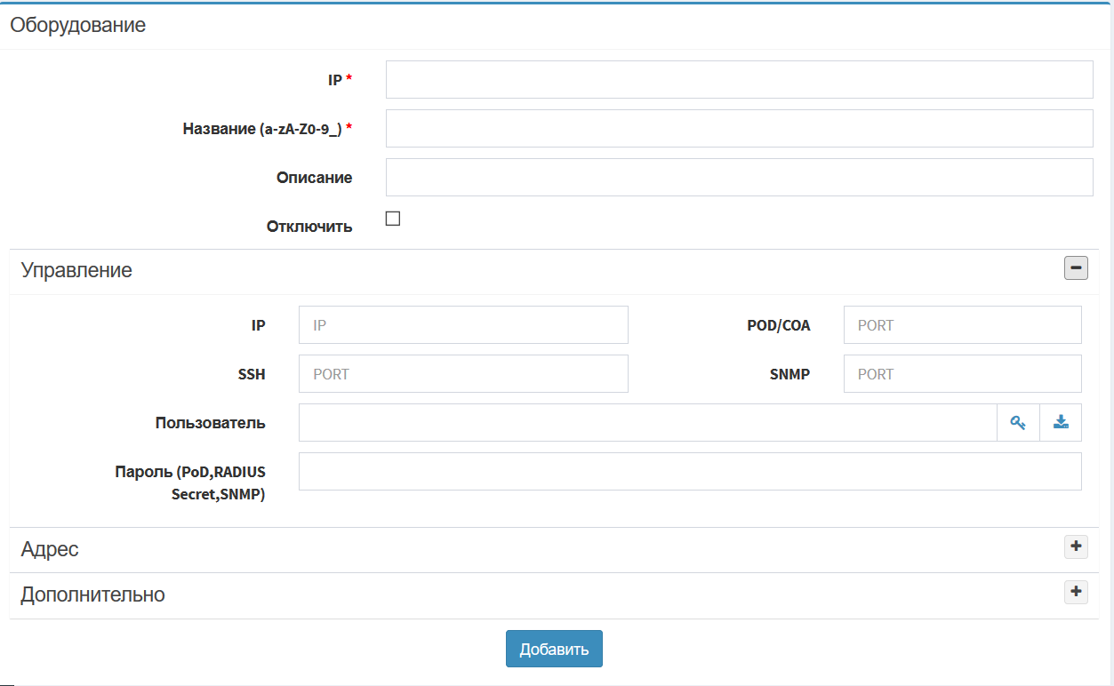 Управление | IP - IP адрес оборудования, в большинстве случаев он совпадает с IP адресом устройства SSH - порт (если поле не заполнено, по умолчанию значение 22) POD/COA - порт (если поле не заполнено, по умолчанию значение 3799) Пользователь - логин доступа по SSH или Telnet Пароль (PoD,RADIUS Secret,SNMP, SSH, Telnet) - ввести пароль пользователя |