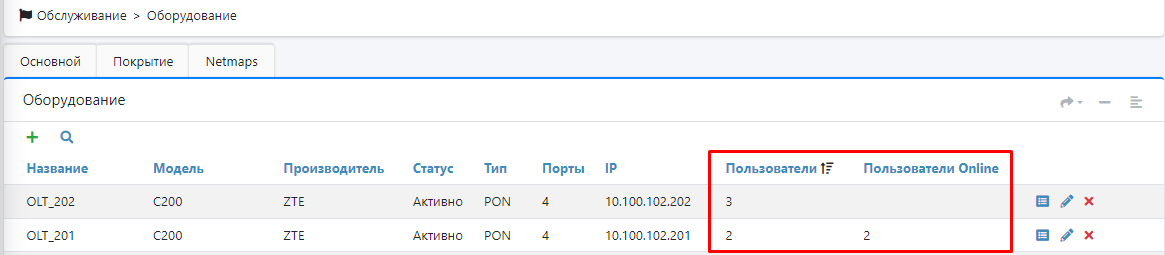 Если включен модуль Internet, будет показано количество абонентов всего и онлайн на каждом коммутаторе