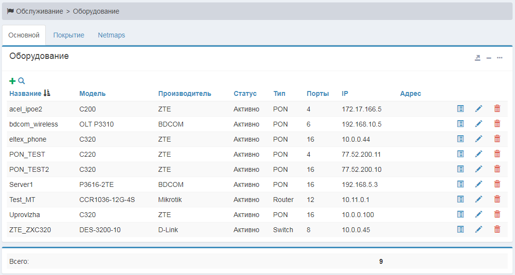 Оборудование | IP - IP адрес оборудования Название (a-zA-Z0-9_) - название оборудования Описание - описание оборудования Отключить - метка для отключения оборудования |