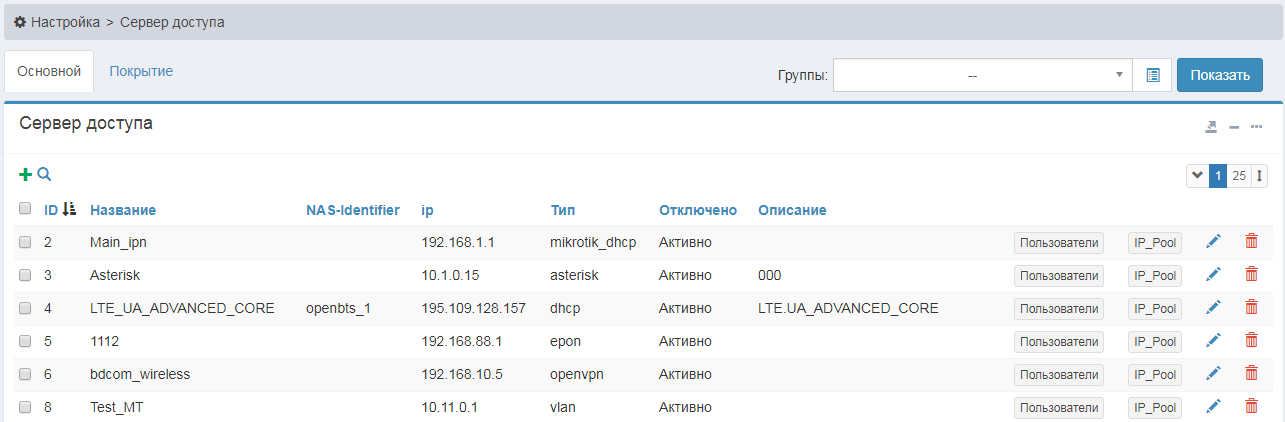 Меню Настройка>Сервер доступа показывает список всех заведенных серверов доступа, их тип, состояние и другие параметры.