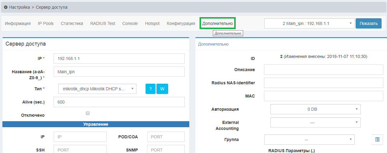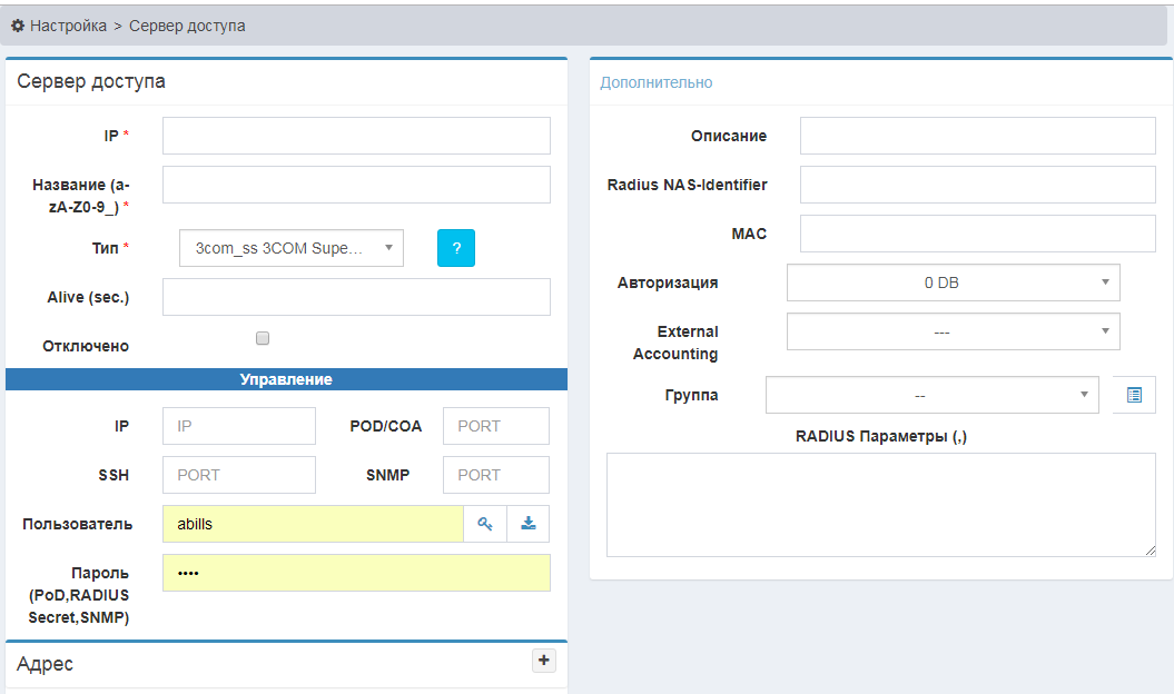 | Управление | IP - IP адрес сервера доступа SSH - порт (если поле не заполнено, по умолчанию значение 22) POD/COA - порт (если поле не заполнено, по умолчанию значение 3799) Пользователь - логин доступа по SSH или Telnet Пароль (PoD,RADIUS Secret,SNMP, SSH, Telnet) - ввести пароль пользователя |