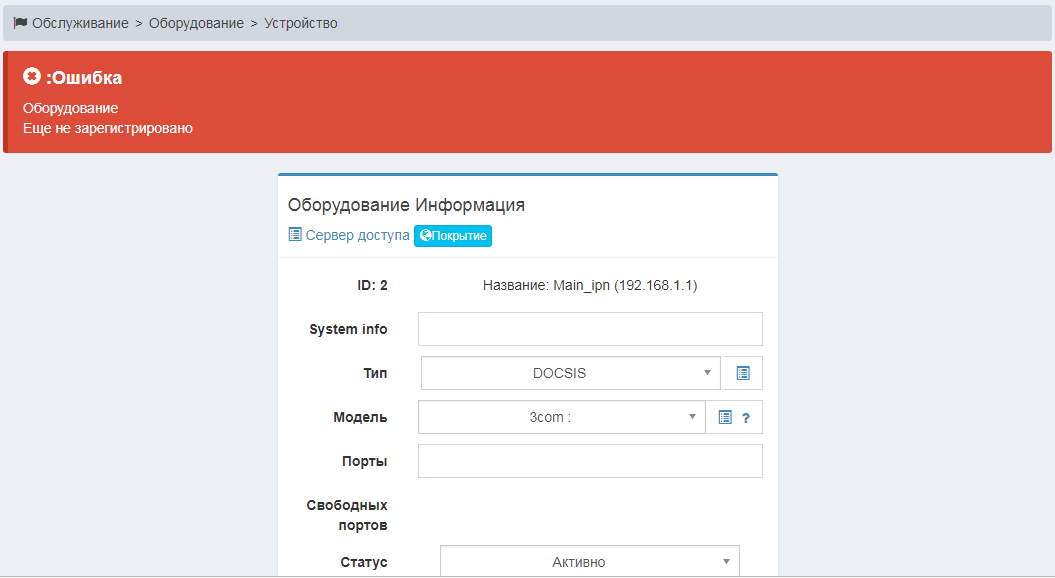 Так как модуль Equipment является расширением для предоставления дополнительной информации по серверам доступа (коммутаторам), то сначала нужно завести сервер доступа через меню Настройка>Сервер доступа нажатием кнопки (Добавить).