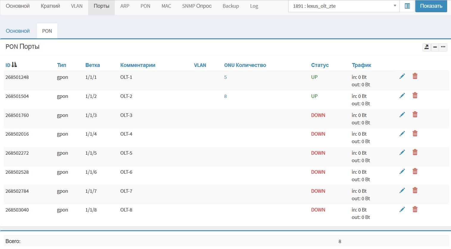 Информация по PON портам с отображением количества ONU подключенных к ним.