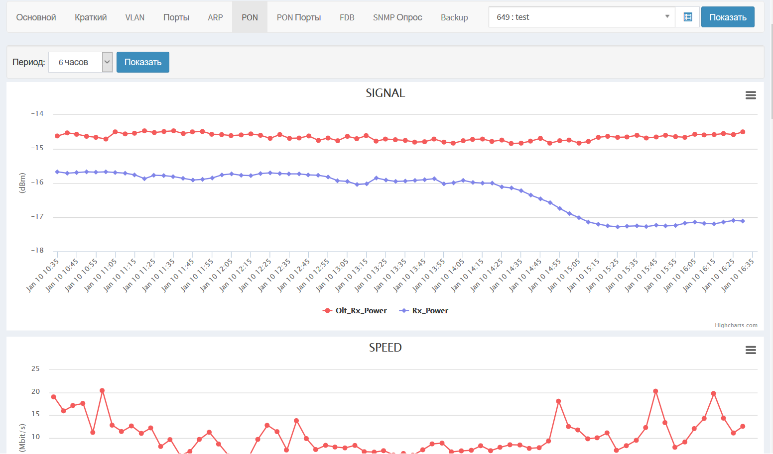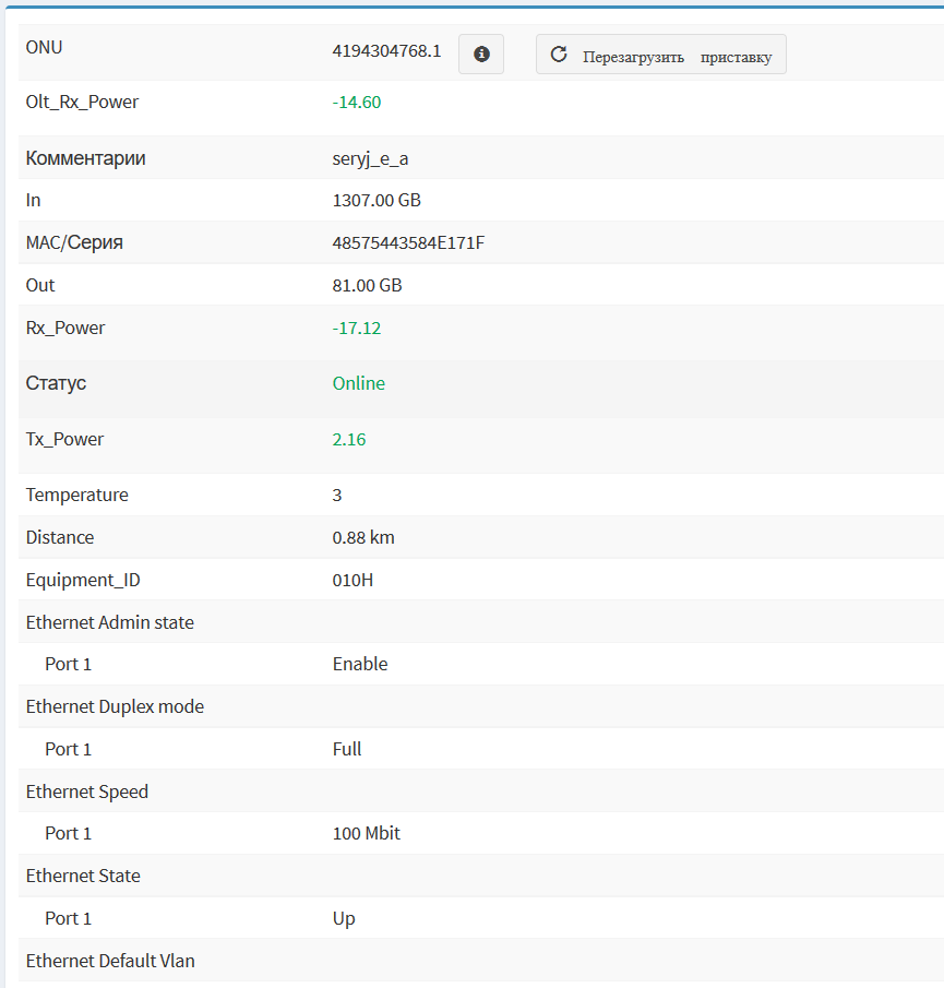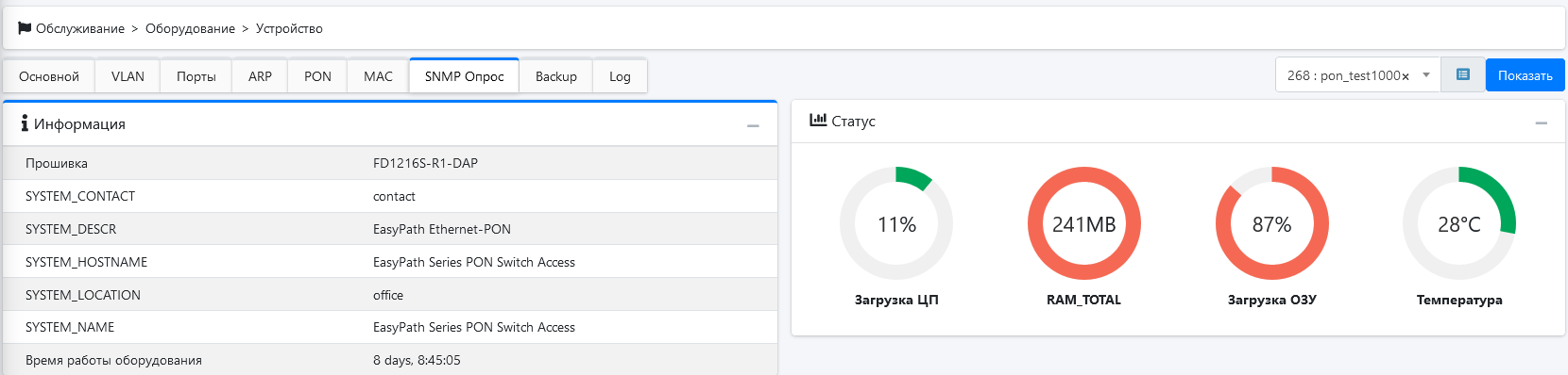 Информация о PON устройстве появляется если оборудование поддерживает PON. Предоставляется информация о подключенных ONU устройствах уровнях сигнала и другая информация предоставляемая оборудованием считыванием информации с OLT занимается программа PON GRabber. Уровни сигнала и другая информация.