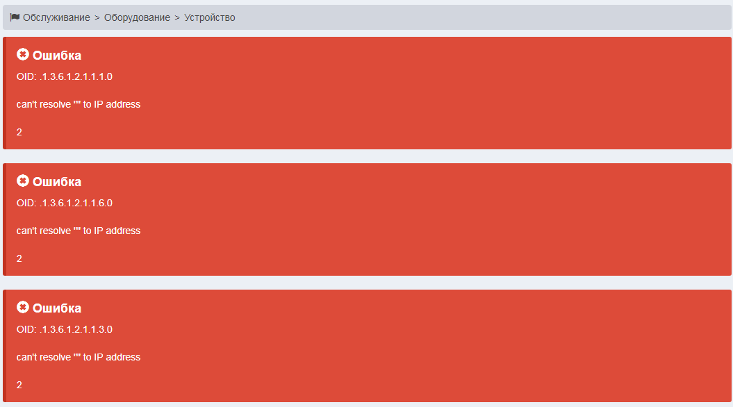 Ниже пример сообщений об ошибке после нажатия кнопки : ошибка - отсутствие связи с устройством. Возможные причины ошибок: устройство выключено, неправильно настроено Snmp Community на устройстве.