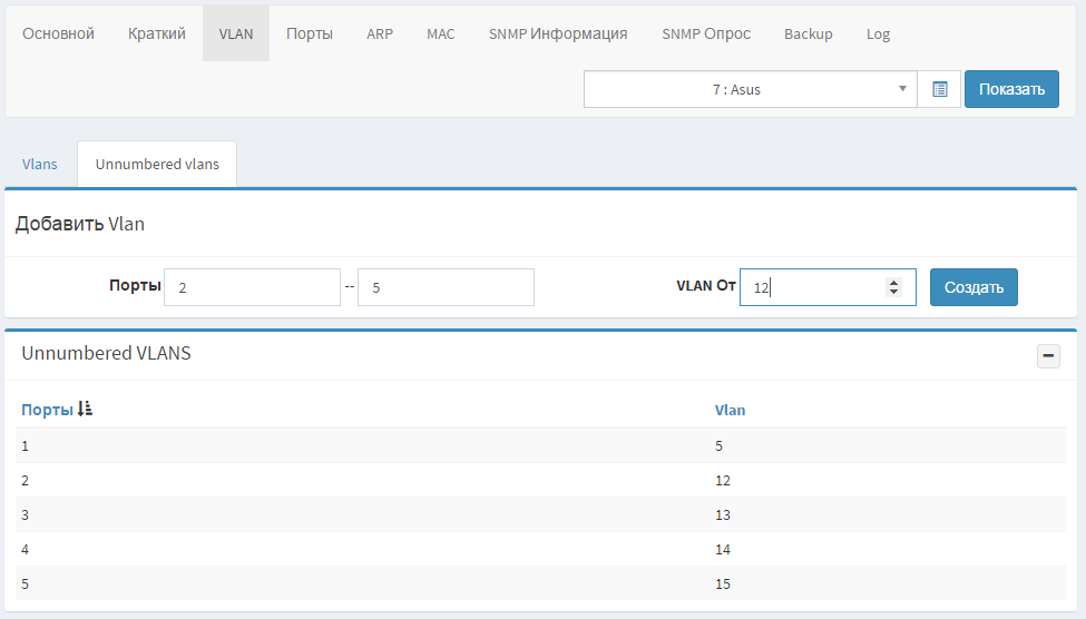 Закладка Vlan отображает информацию полученную от устройства. Unnumbered Vlans позволяет присвоить Vlan'ы портам устройства вручную.
