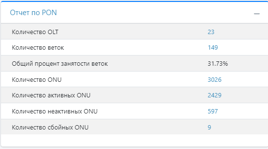 | Количество OLT | Количество оборудования с типом PON. |