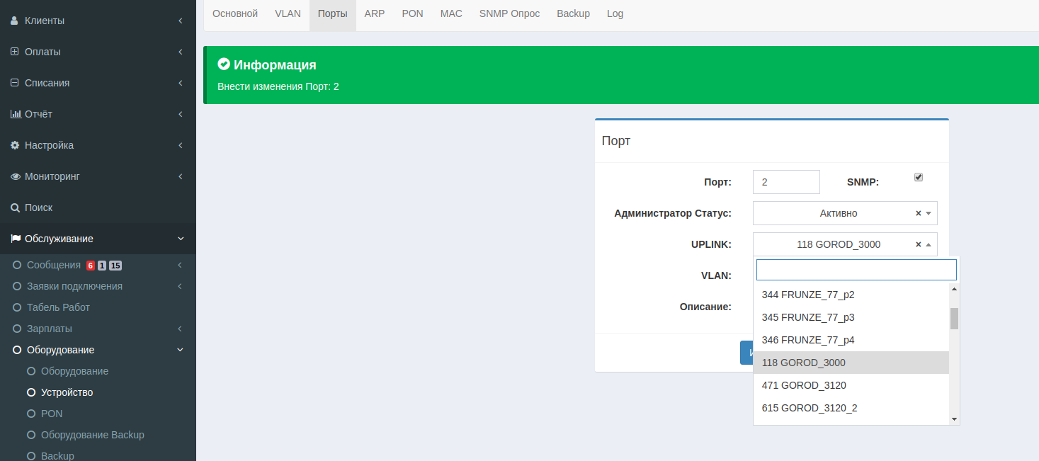 Нажмите на значок карандаша и в поле UPLINK выберете нужный вам OLT.
