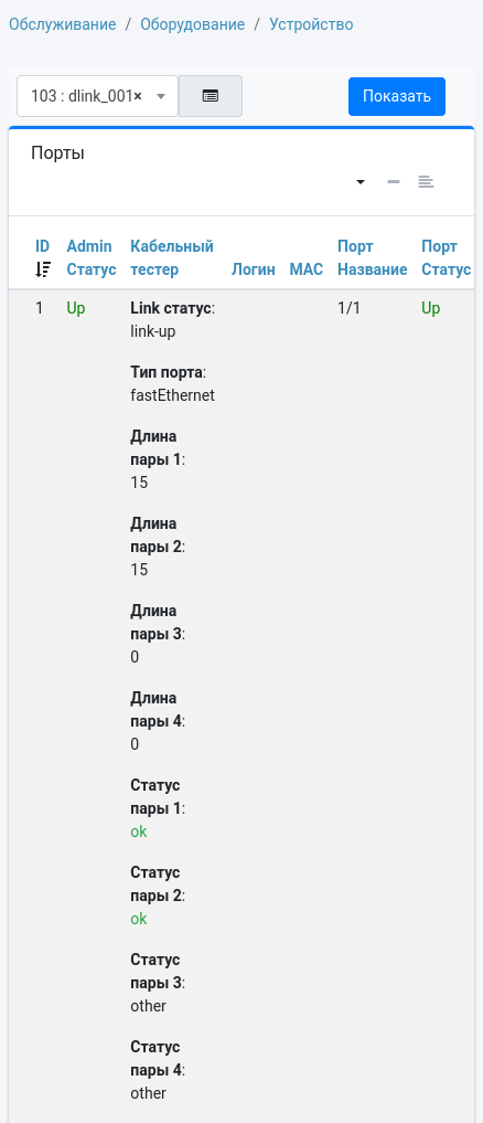 Можно провести тест кабеля для каждого порта. Для этого нужно на странице "Порты" оборудования включить доп. поле "Кабельный тестер", тогда возле каждого порта будет отображаться результат теста: