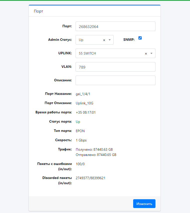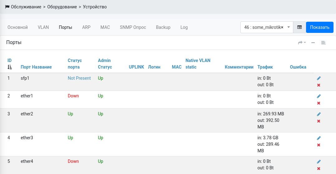 Здесь отображается информация про порты, которая забираются по SNMP с оборудования.