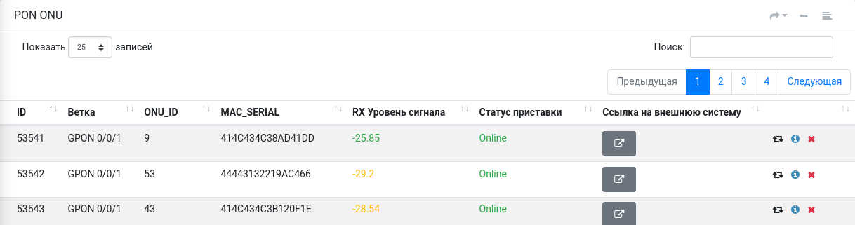 Отображается в списке всех ONU (если включено доп. поле "Ссылка на внешнюю систему"), и на странице конкретной ONU.