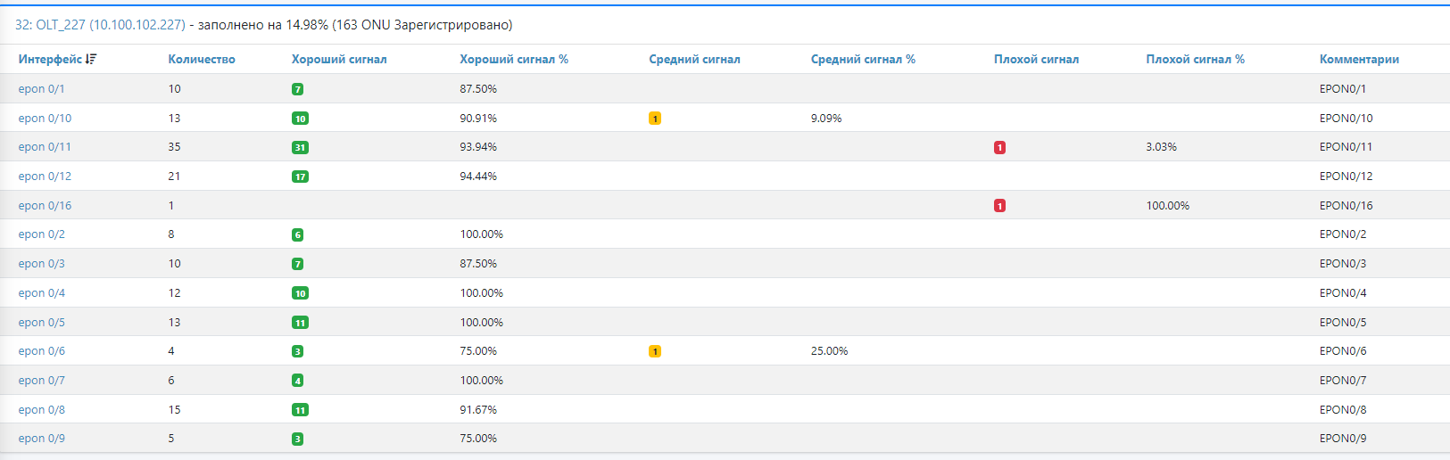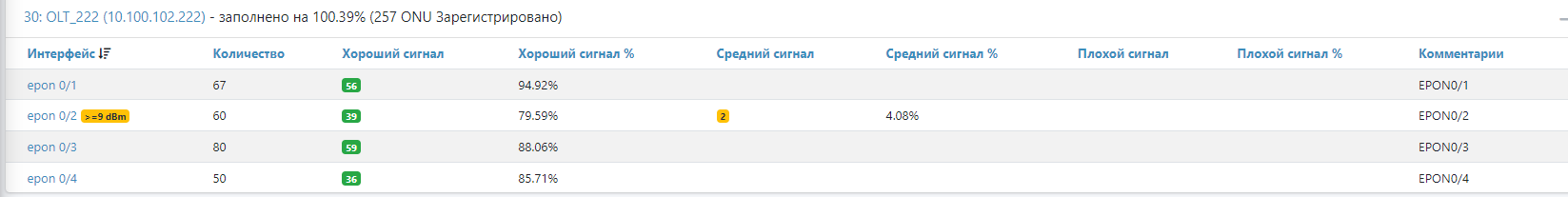 В отчете выводится информация по количеству ONU (epon, gpon, gepon) с хорошим, средним и плохим сигналом. При нажатии на значок из средним или плохим сигналом будет переход на список PON из соответствующим статусом.