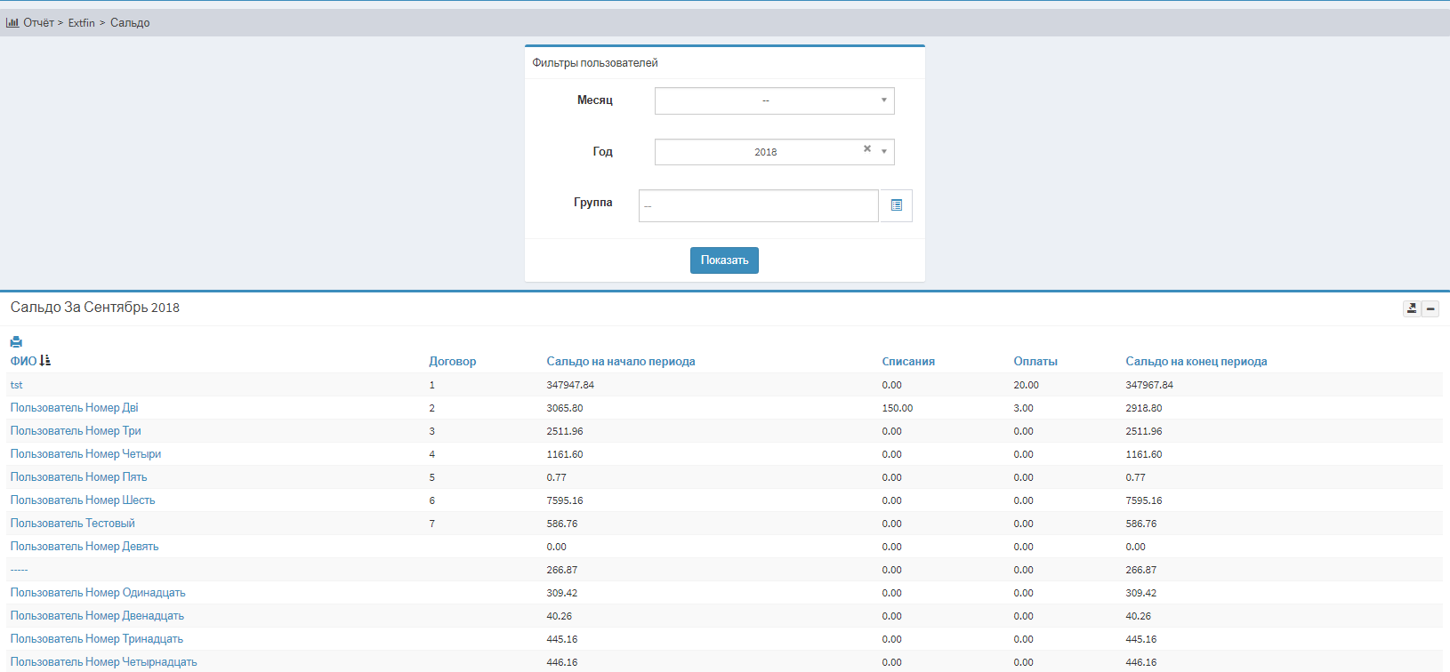 В таблице показано сальдо на начало периода, оплаты и снятия за выбранный месяц, и новое сальдо. Можно отфильтровать данные по месяцу и году.