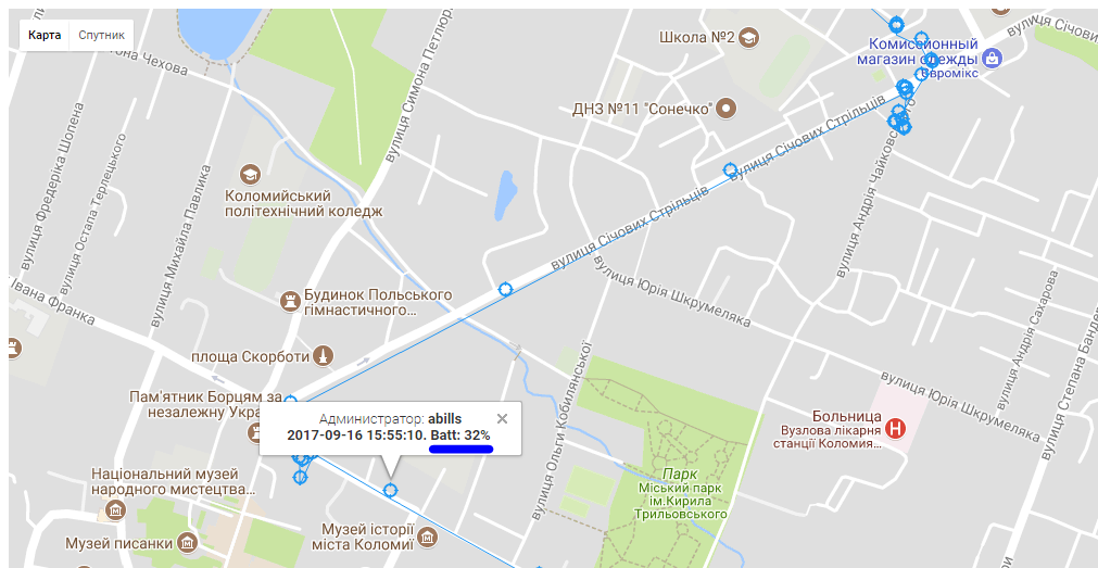 На каждой точке можно увидеть время и заряд батареи.