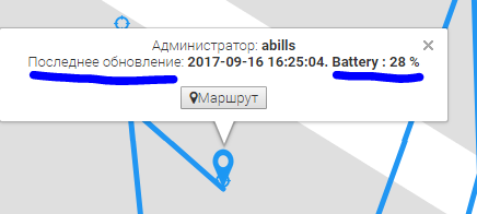 Маркер показывает на карте последнее местоположение сотрудника и заряд батареи.