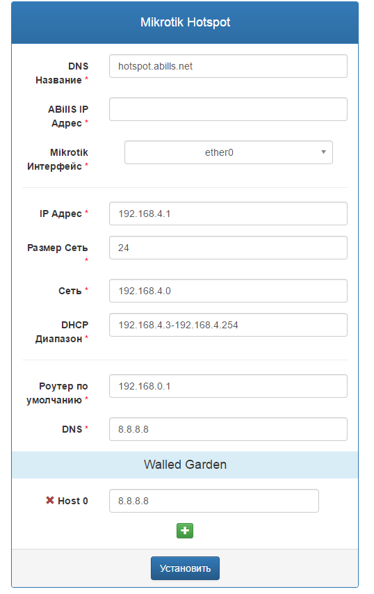 | Mikrotik Интерфейс | Интерфейс микротика для конфигурации хотспота (список интерфейсов подтягивается с устройства) |