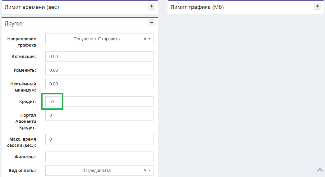 | Кредит: | Кредитный лимит тарифного плана Кредитный лимит тарифного плана имеет более низкий приоритет, чем кредитный лимит пользователя |